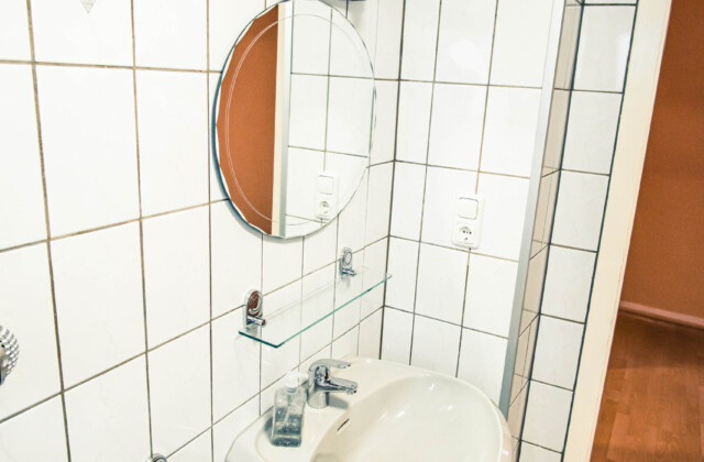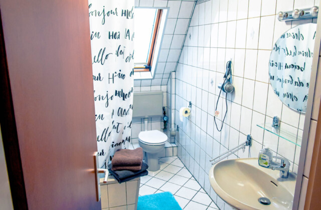 Badezimmer: Toilette, Waschbecken, Badewanne