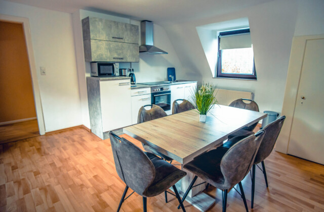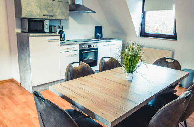 Küche: Kühlschrank, Herd, Spülbecken, Mikrowelle, Kaffeemaschine